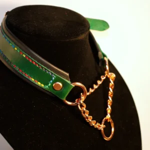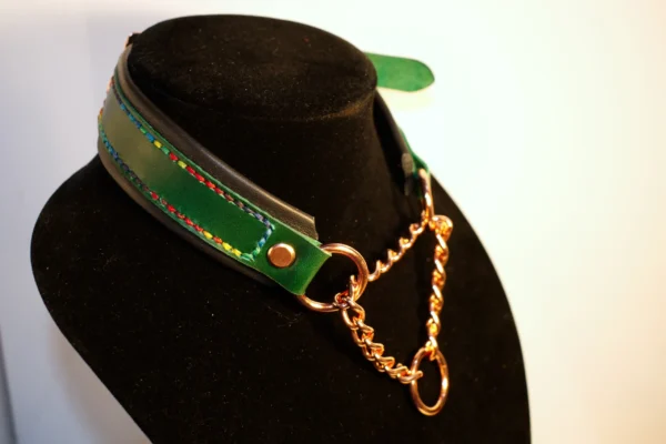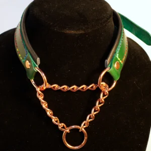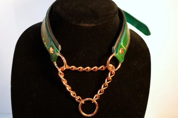 This padded martingale collar is made from of durable burnished leather with a soft leather padding that lays against the skin to maximize comfort even while getting led around. The chain and other hardware can be customized to a variety of colors that can add a sense of flair to any occasion.